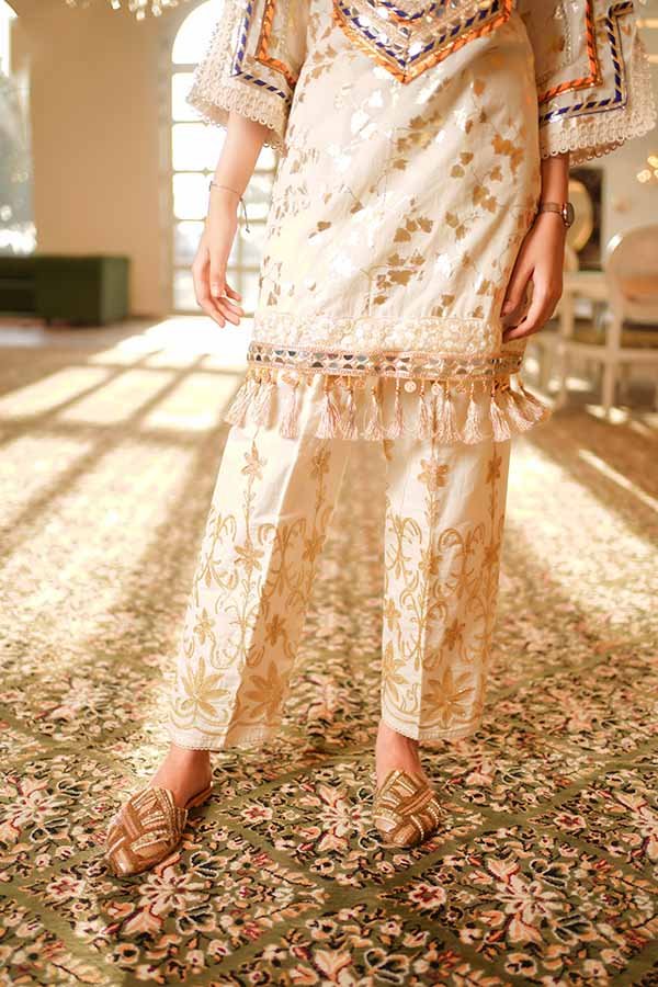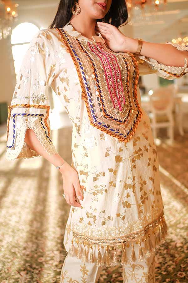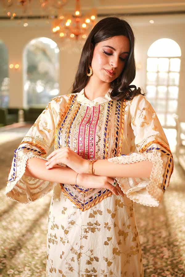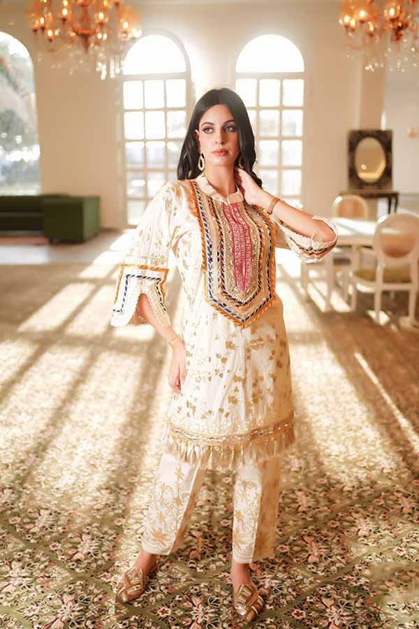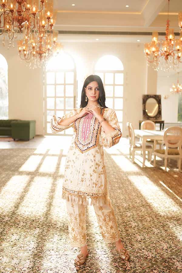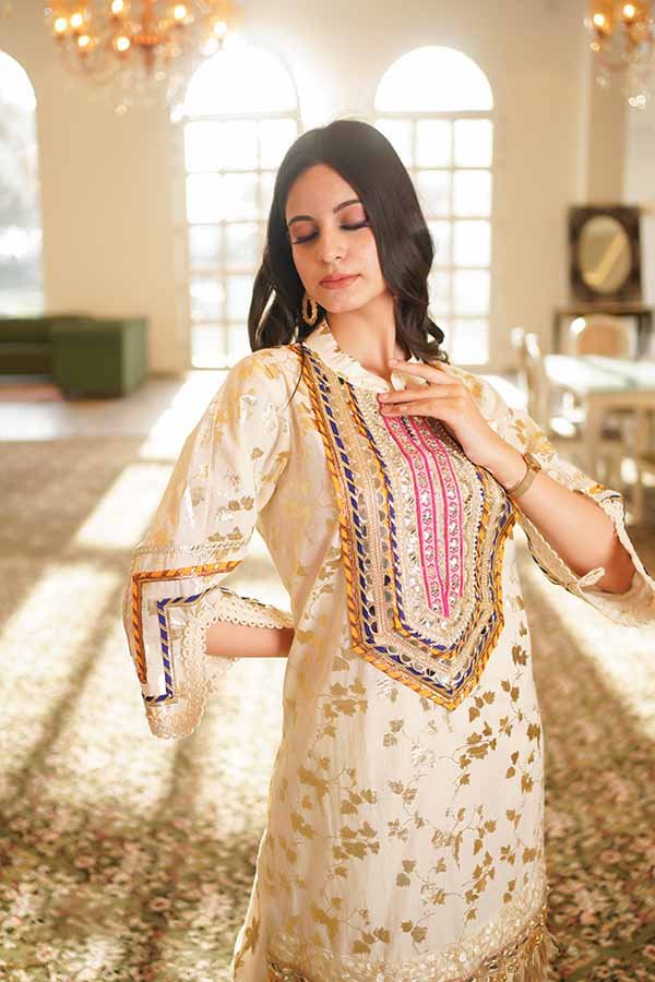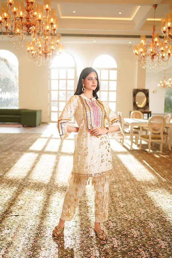 A graceful printed kurta and pant outfit with delicate detailing, designed for elegant festive and daytime occasions.
