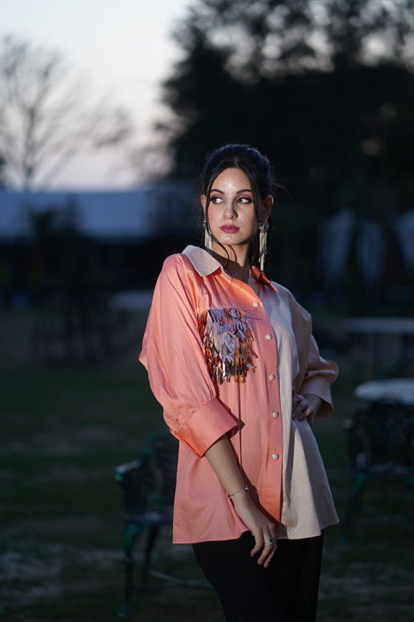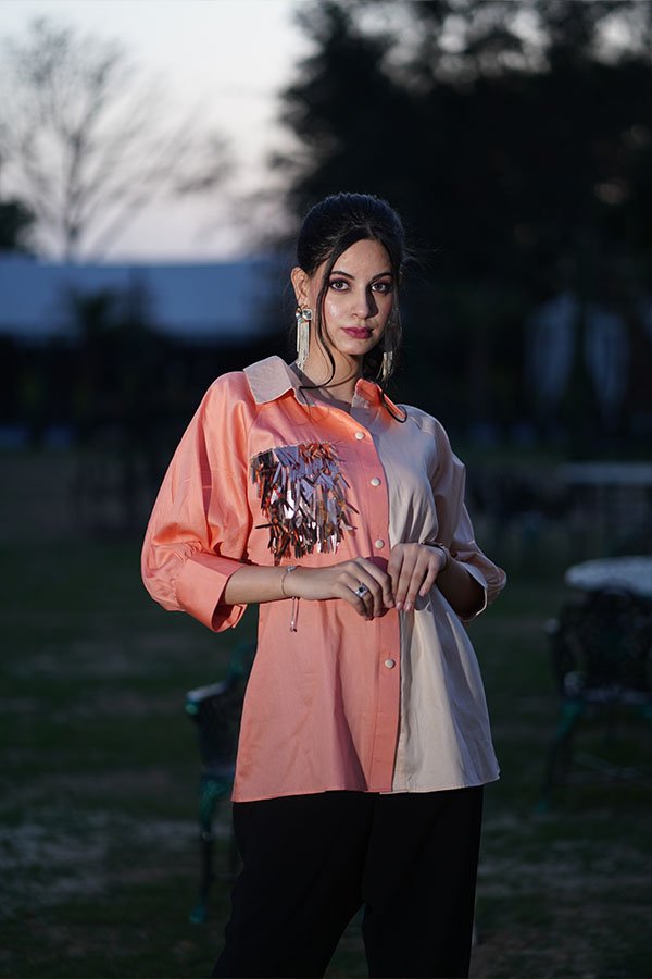 A stylish contrast shirt paired with black pants, designed for modern everyday wear with a polished look.