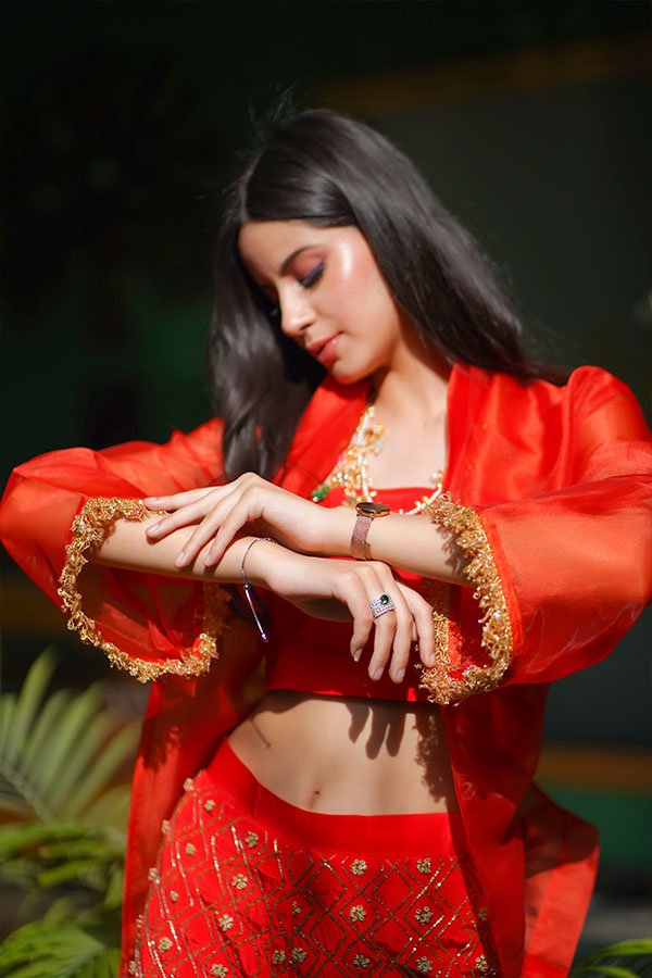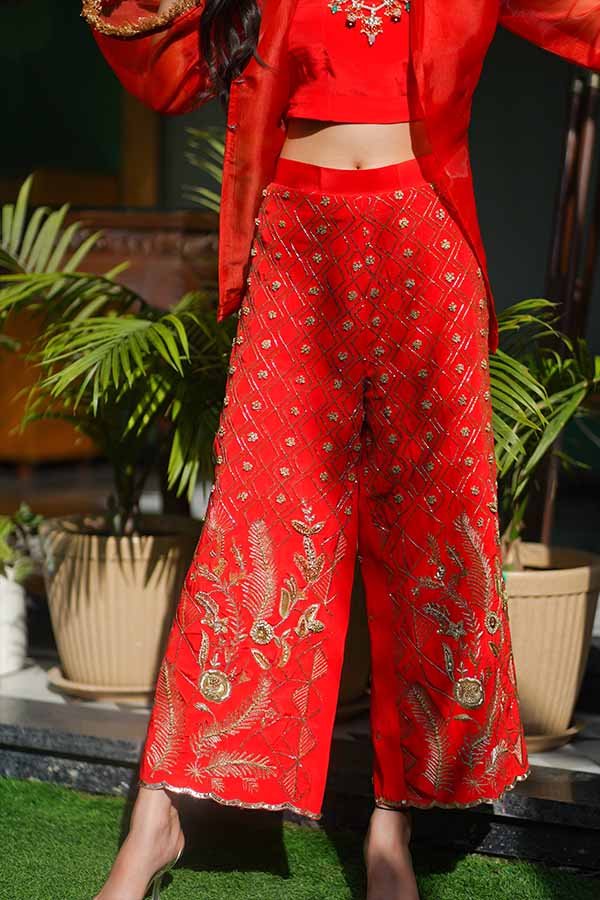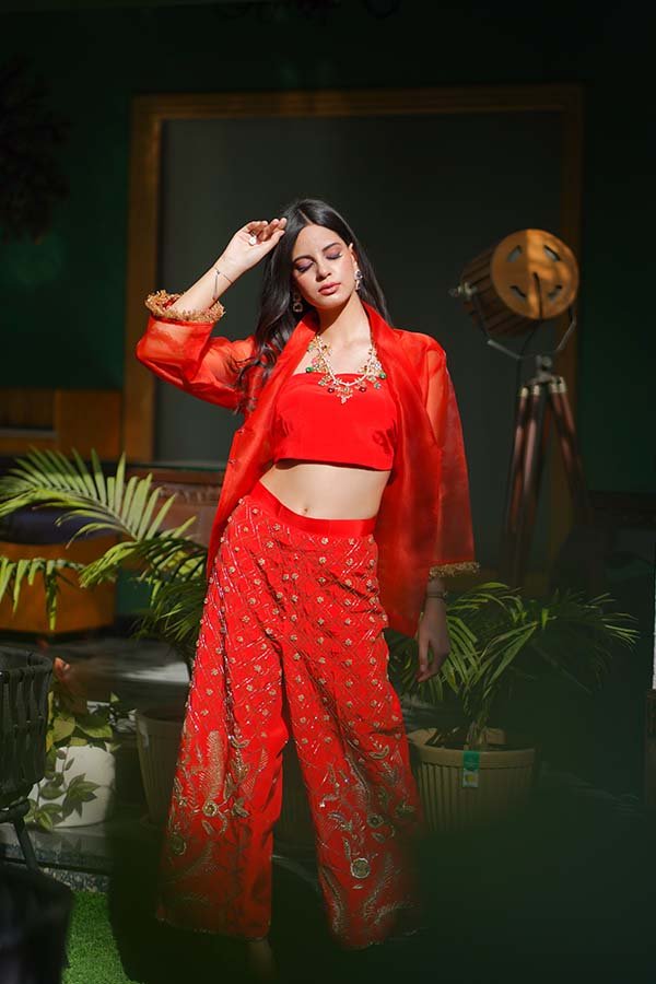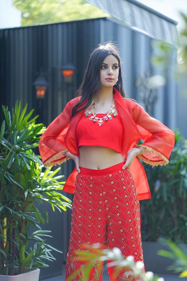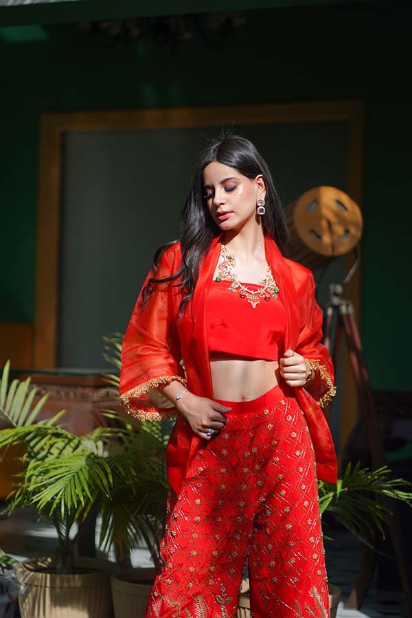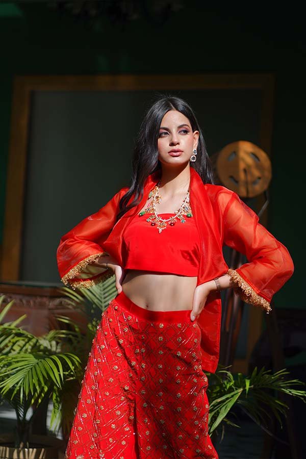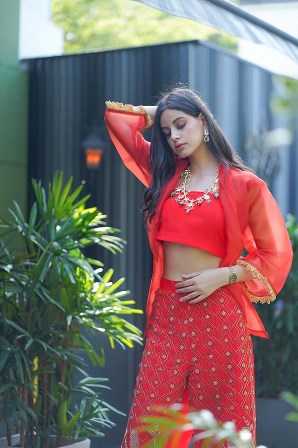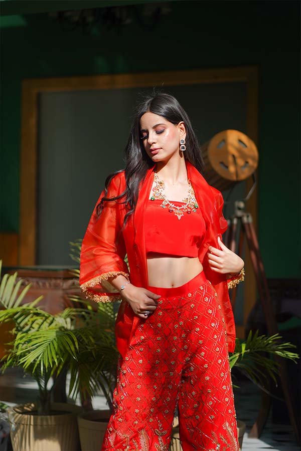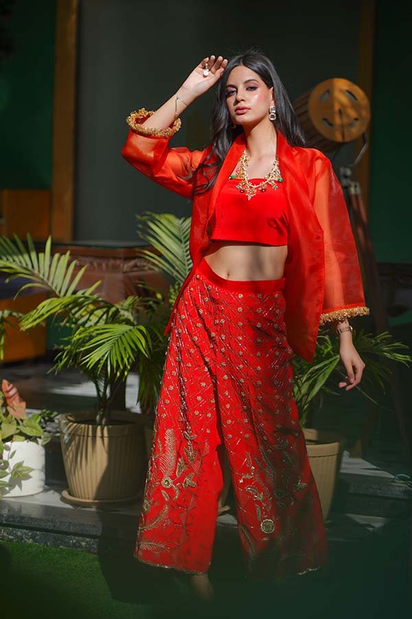 A vibrant festive co-ord set featuring a cropped blouse, embroidered trousers, and a sheer jacket for a graceful ethnic-fusion look.